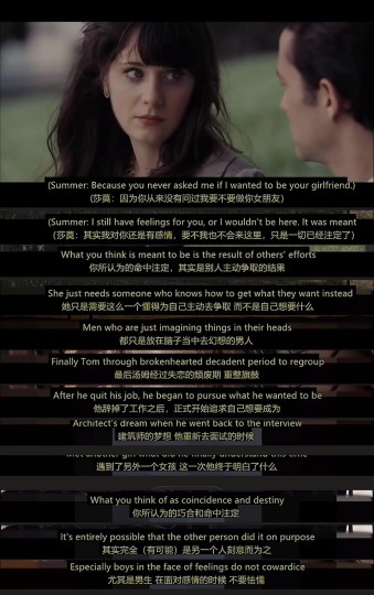 观点2: 男主跟大部分人一样 缺乏安全感却又不敢主动表达 让女生一步步做出离开的选择。 是的 这个观点跟第一个观点相差真的很大 但是听完解说之后我也是真的茅塞顿开。 男主并不主动 这是真的 在电梯里summer主动开口与其说话也没有很大的反馈;天天在那里胡思乱想却并没有实际行动 跟朋友倾诉自己和summer的对话且曲解意淫出对方的不好 朋友让其约她出来 男主也是怂直接说别犯傻了 这点真的没有任何实际行动;在酒吧聚餐完之后也不敢主动表达好感 只好说做朋友;第二天上班summer主动献吻也毫无表示;女性summer在这段感情里是最缺乏安全感的那一个 因为男主从始至终都没有说过我喜欢你 在床上暧昧的时候 summer说我不想太认真 男主也直接说可以无所谓 只要开心就好 没有给对方安全感;在酒吧里被骚扰了 男生也不敢主动上前帮忙摆平 却因为一句被伤自卑的话忍无可忍 这样也确实理解了女生生气的点;双方因为这个事情生气了之后 男主也不敢打电话认错 没有主动的勇气 还是女方自己上来say sorry的;在草坪中那段summer主动引导男主喊“丁丁”“老二”“牛子”的情节 真的已经可以理解为summer想让男主主动勇敢一点 说出自己想要的关系。 如果还不够理解summer的 可以继续看我接下来的分析:男主是想学建筑设计的 但是毕业之后也一直在写信公司工作 原因是他没有主动放弃一个工作从头来过的勇气 不好听的就是得过且过 男主不差 在公司是最被老板欣赏的 画画也很好看 就是没有勇气;前面很多意淫和后面那段男主去summer家的派对(期待与现实)表明了男主从始至终都没有勇气去面对这样的事情 因为生活一直顺风顺水;看电影不理解电影后面对抢婚之后超长片段的含义 summer在看完那个电影之后流泪也正是要和男主渐行渐远 看破一段关系的时候。(那个阶段的自己不够强大,不够主动,忽略了她最想要的。)summer一直以来都想要男主的坚定选择 但是全片下来男主的懦弱从来都没有坚定的选择对方 并且付诸实践。最后summer与男主在椅子上还碰男主的手 其实也是说明了她一直都爱着男主 但是男主从来都不够勇敢与坚定 没办法 他俩不是一路人。 最后结局是的 男主因为这段关系开始改变自己 放弃了现在的工作开始追求梦想 面对新的关系也主动出击 他最终还是改变了。 总结: 面对一段关系的时候我们需要勇敢表达并且付诸实践 女生会被诚意所打动的 当然我们需要自己能够左右自己的生活和有自己的想法的时候爱情就会到来。
