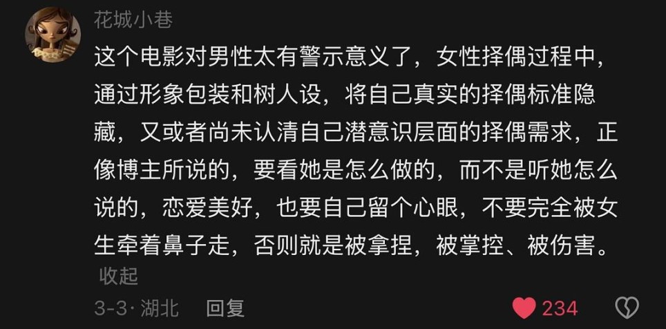 看完这部电影我相信很多人都跟我一样 感觉男主跟自己很像 summer也和自己之前相处过的女生很像 但是看了两个解读电影的之后发现怎么对这部电影的想法能差异这么大。但确实这部电影主要是站在男性的视角来探讨两性关系的 终究是自己来发现问题。 观点1: 也就是跟我看完这部电影时候的想法一样,男性不能将自己的情感寄托于在别人身上。 summer是一个普通的女孩 她遵从自己的内心 想做什么就做什么 她喜欢自己的长发但是又能毫不留情地将其剪去 女性是绝情的 因为在很多事情上面她们都能享受自己魅力带来的便利 比如去雪糕店打工带来了很多的客人 租房子比市场上更低价 坐公交有几十次几百次的被回头看 例子真的是很多很多 代入我身边很多女性朋友的视角 也确确实实是如此 有的经常在dy被私信有的出来吃饭也被搭讪 数不胜数。而男生很多也跟男主一样 因为女生随意的一两句话而脑补出很多乱七八糟的东西 说好听是脑补 不好听则是意淫 一旦出现一个这样的女生就会不断陷入一段段脑补出来的画面 会对这个女孩越来越在乎 想各种各样的方式引起女生的注意 是的 这就是我们哥布林的做法。 女生主动起来便可以和我们快速地发展起来 我们也会不由自主地陷入其中 不管对方是否说出不想认真的话 自己也会欺骗自己 那就不认真吧。summer带他走进了自己的世界 在床上吐露了从来没跟人谈论过的心声 自己也会在想我真的这么重要么。 女人总是做自己喜欢做的 虽然她与我足够亲密 但男女主始终不是恋人 没办法 在喝酒的时候被骚扰自己也没有名份去保护 只有尊严被人践踏的时候才敢还击 而女生也没有站在自己的角度思考自己是否做错了 还生气了。当时看到这里真的忍无可忍 男人没有脸面尊严是真的不可以。 后面summer真的只是把男主当成普通朋友 无视男主 和其他女生戴上钻戒 最后也能毫无悔意地做出与自己之前说过相违和的话 与一个男人结婚。所以人是会变的 什么都会变 不要看定一个人就想与一个人一辈子 不可能的 什么都会变 正像summer不愿意给男主一个口头承诺一样 结婚的誓言也没有用。