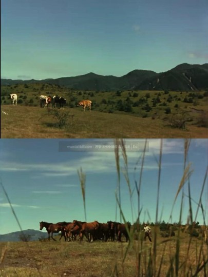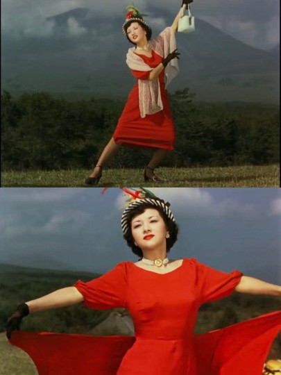 电影在场面调度方面,运用空间配置、镜头运动、声音、色彩、服装等要素,营造卡门和朱美作为乡村的外来者的身份。影片的开头,运用完整的长镜头,展现了广袤的山脉和原野。配乐是悠扬的纯音乐,伴随着马群的嘶鸣。随后镜头缓缓向左转动,银幕上出现马群与卡门父亲的身影。这个镜头的运动平和舒缓,将人物放置在宽阔的自然之中,营造出人物与环境的一体感。而伴随着姐姐呼喊的画外音,镜头的连续运动被打断。尽管此时主人公并未登场,但卡门的回归从影片一开始便伴随着不和谐的氛围感,是打扰牧场的祥和安宁的因素。待到卡门在影片中初次登场,她出现在了小镇的火车站。这一组镜头中,摄像机的运动速度较快、剪切频繁,还伴随着火车的杂音和嘈杂的人声。与牧场象征的乡村、淳朴和自然的空间不同,火车站可以被视为现代化、流动与外来的空间。摄像机的运动速度与声音,共同构成对两种不同的空间特征的刻画。而刚下火车的两位摩登女郎,则身穿高饱和度的红色、黄色的紧身裙。这与周围村民们黑色、褐色的正式西装,以及姐姐的深蓝色和服都形成鲜明对比。在后来两位女郎在山坡上跳舞的镜头中,她们的裙摆格外醒目。牧场的绿色与天空的蓝色衬托着她们的裙摆,沦为纯粹的背景,而摄像机的距离和角度多方位地变换着,力图展现她们的姿态。不同于影片开头中展现的父亲与牧场的一体感,这两个身着都市时尚服装的女性与周围环境彼此独立,像是两朵人造的假花出现在草地上。影片的一开头便利用多重场面调度营造出的不和谐感和对乡村而言的“异域风情”,为后面的冲突埋下了伏笔。